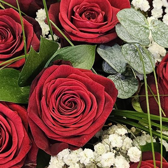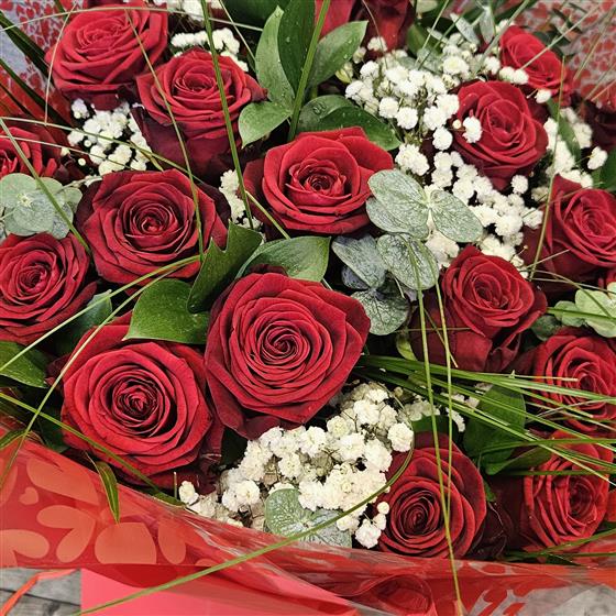 A stunning handtied of 24 best red roses, with gypsiphila, different types of greenery and bear grass. Arranged in a water bubble, wrapped in cellophane and placed in a gift bag. Definitely the wow factor!