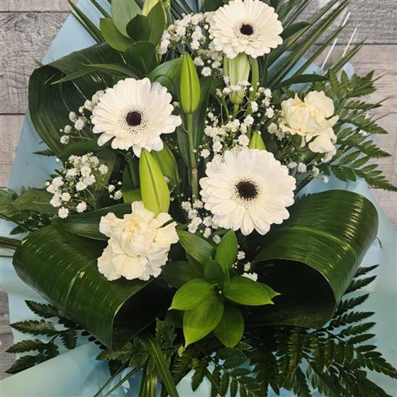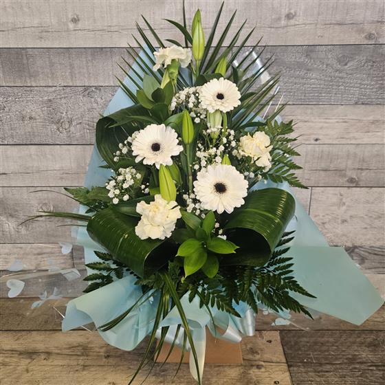 A stunning and easy to look after arrangement of flowers, with lilies. Presented in a gift box of oasis and water, wrapped in cellophane and a bow.