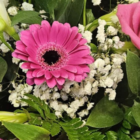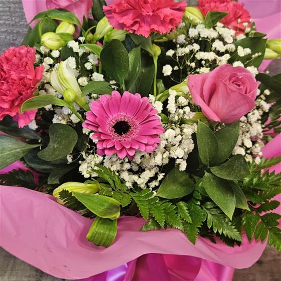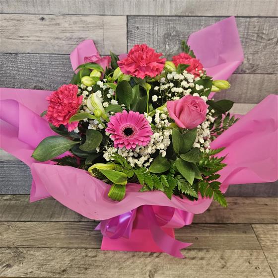 A stunning and easy to look after arrangement of flowers presented in a gift box of oasis and water, wrapped in cellophane and a bow.