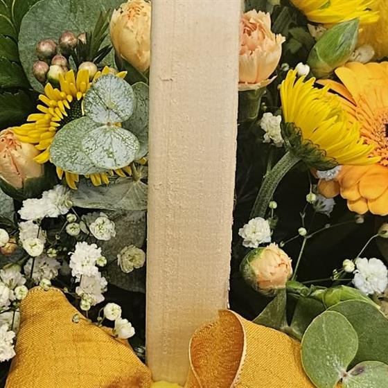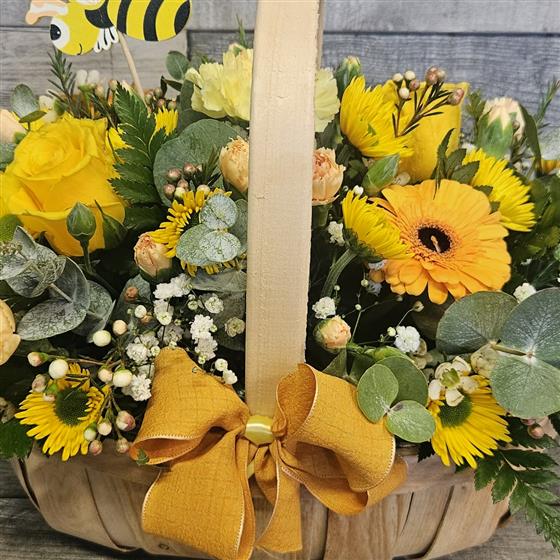 A beautiful arrangement in a wooden trug basket, with a mixture of seasonal flowers! The perfect gift for mothers day.