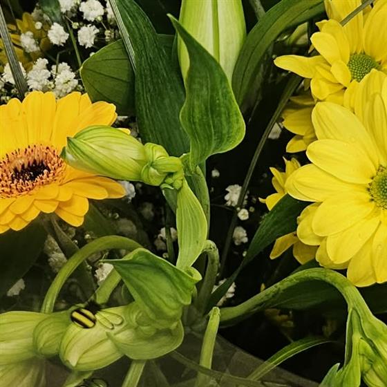A seasonal hand tied arrangement of fresh flowers presented in a high quality glass vase. Wrapped in cellophane and finished with a bow.