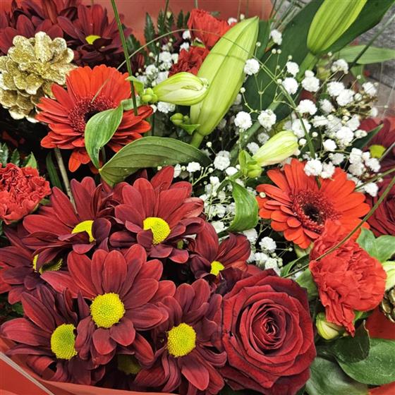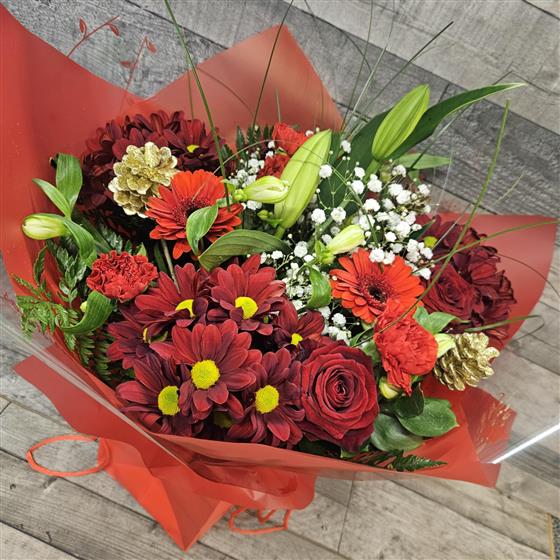 A seasonal mix of gorgeous flowers arranged in a handtied display. Wrapped in cellophane with stems drinking in a water bubble. All placed in to a gift bag, which make this design easy to transport.