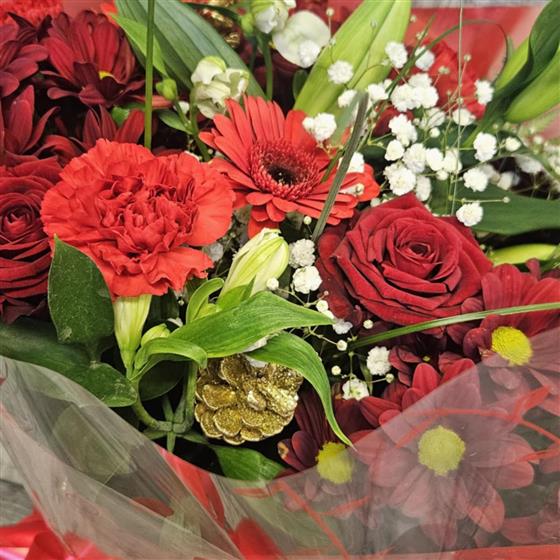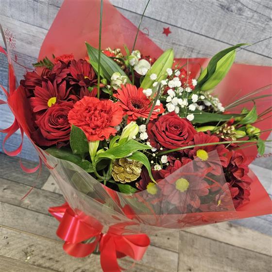 A seasonal mix of gorgeous flowers arranged in a handtied display and placed in to a glass vase. Then, Wrapped in cellophane and a big bow placed on the front.