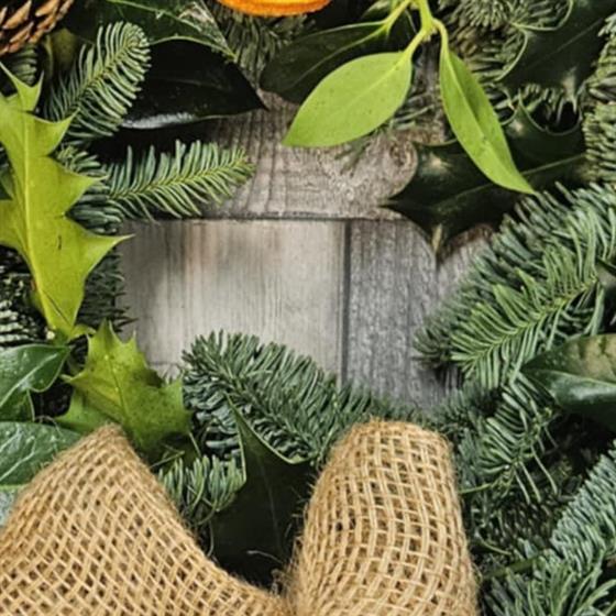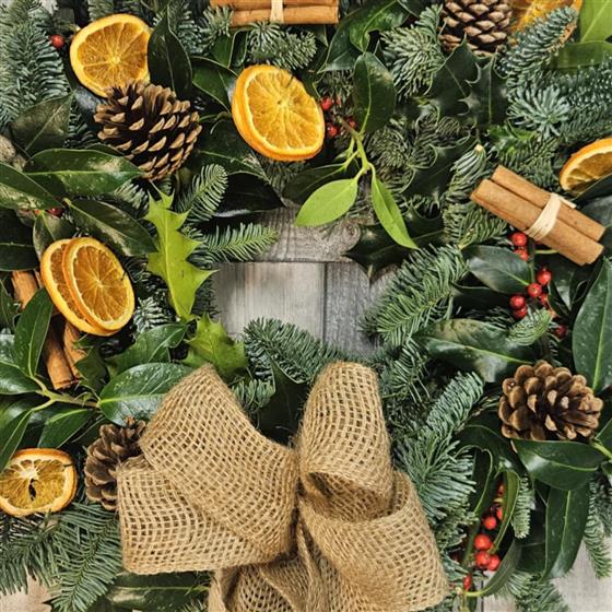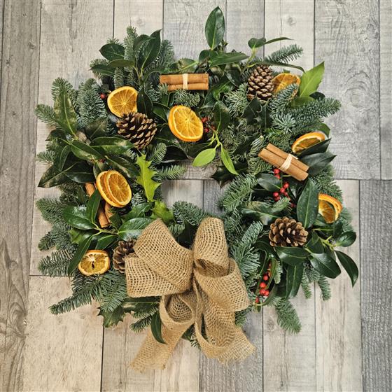 A fresh wreath made with holly and spruce, decorated with berries, pine cones, cinnamon sticks and dried orange slices. With a hessian box at the bottom. They smell wonderful!!
