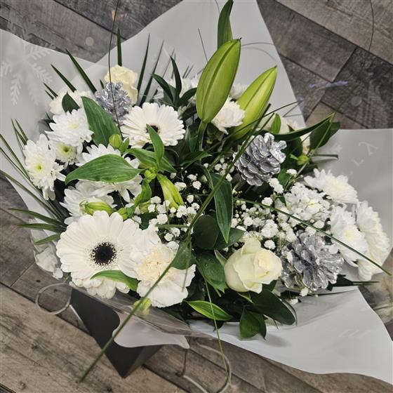 A seasonal mix of gorgeous flowers arranged in a handtied display. Wrapped in cellophane with stems drinking in a water bubble. All placed in to a gift bag, which make this design easy to transport.
