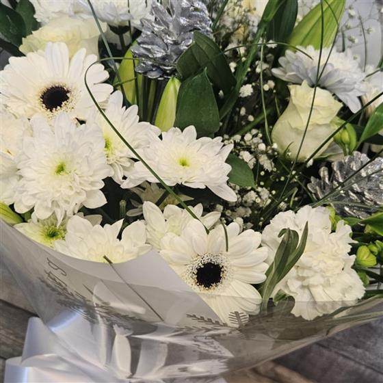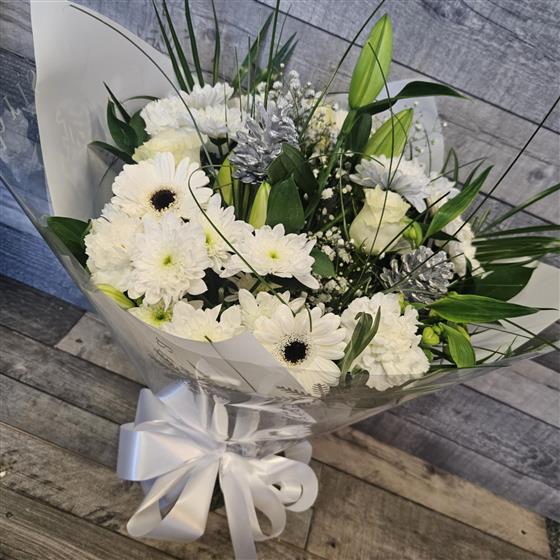 A seasonal mix of gorgeous flowers arranged in a handtied display and placed in to a glass vase. Then, Wrapped in cellophane and a big bow placed on the front.