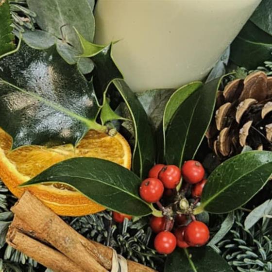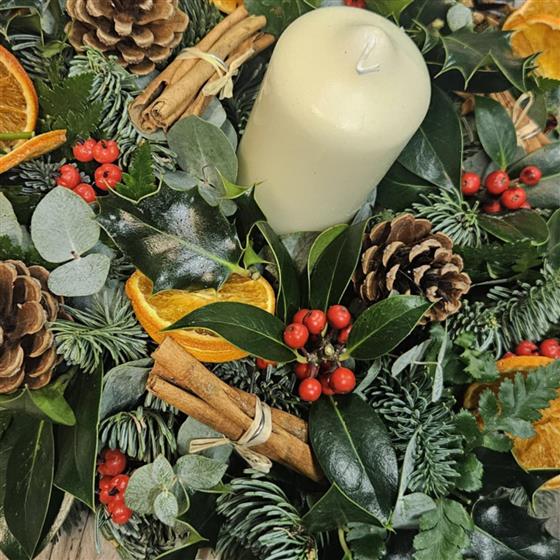 A seasonal posy pad arrangement with a candle in te centre. Made out of fresh holly, spruce and eucalyptus, with berries, dried orange slices, pine cones and cinnamon sticks.