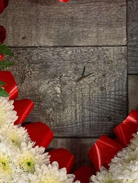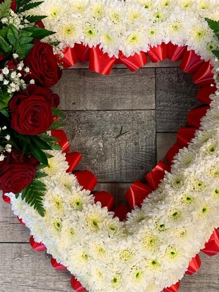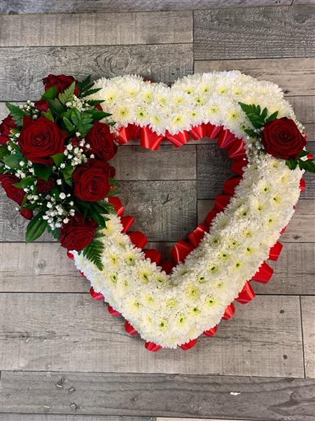 This beautiful tribute is in the shape of a heart with the centre removed, with pleated ribbon around the edge. The base is massed in chrysanthemum head, and is finished off with a stunning spray of seasonal flowers.