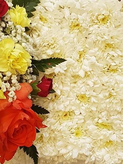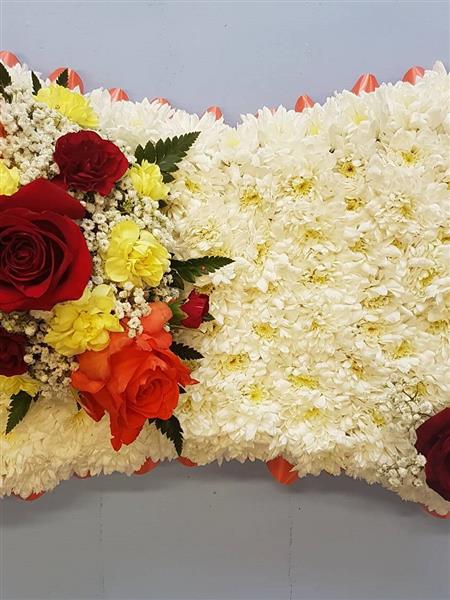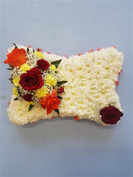 This beautiful tribute is in the shape of a pillow, with pleated ribbon around the edge. The base is massed in chrysanthemum head, and is finished off with a stunning spray of seasonal flowers.