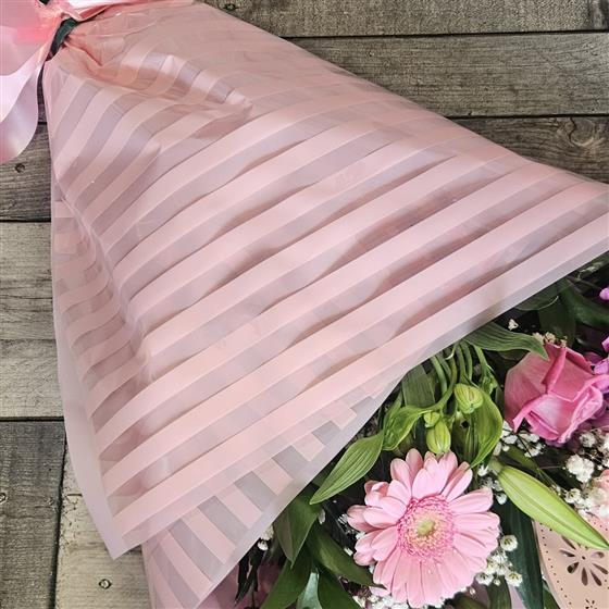 A beautiful selection of seasonal flowers as a flat bouquet, perfect for someone who loves to arrange flowers themselves and put them in water at home.