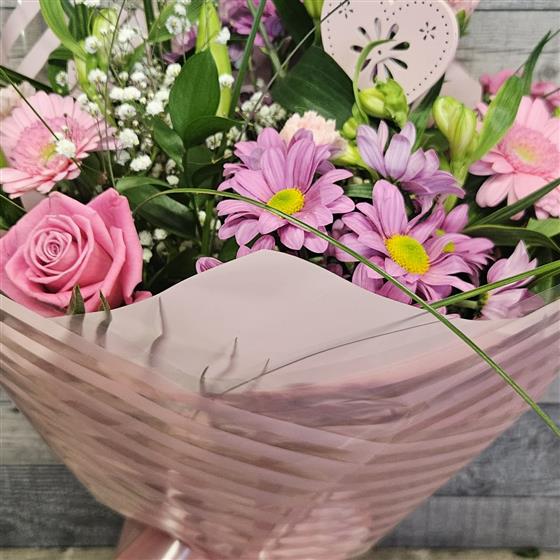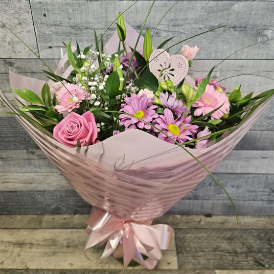 A seasonal hand tied arrangement of fresh flowers presented in a high quality glass vase. Wrapped in cellophane and finished with a bow.