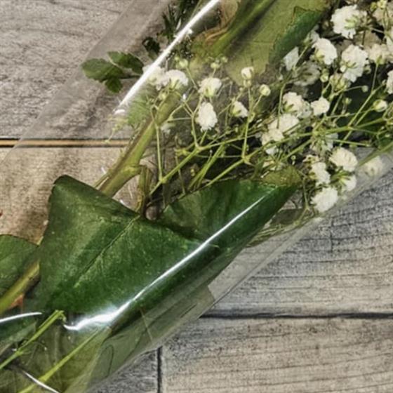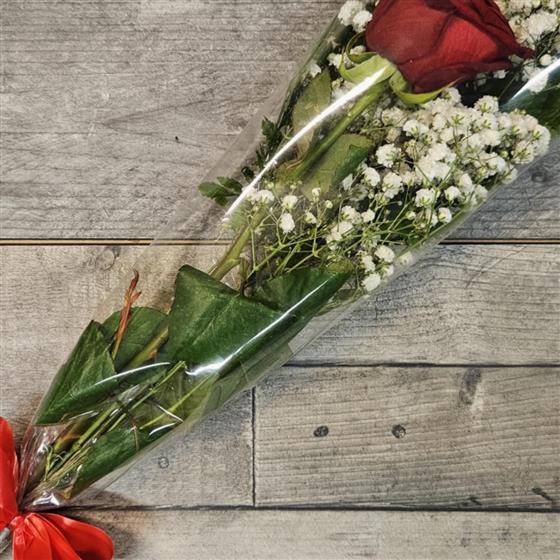 A best grade rose wrapped in cellophane with a piece of fern and Gypsophila tied together with a Bow.