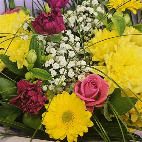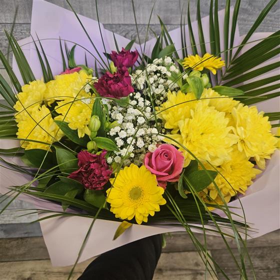 A wonderful handtied of seasonal flowers, wrapped in cellophane and finished off with a bow. perfect for filling a vase at home.